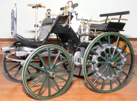 並於 1884 年成功開發出第一具 2 行程汽油引擎,並在 3 年後、1886 年的 1 月 29 日,終於生產出全球第一具、最大馬力約 0.75 匹的 954c.c. 單汽缸 4 行程汽油引擎