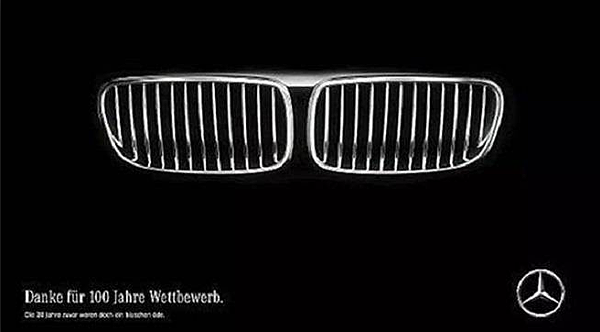 賓士利用刊登廣告大方向競爭者BMW祝賀,除了展現氣度,更表明了自己比對手歷史更加悠久的真相,在祝壽的背後,似乎暗指我才是老大~