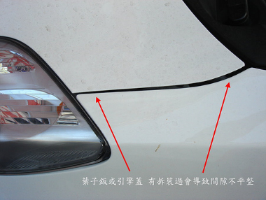 2:鈑件由於組裝科技的進步,車輛出廠時各車體鈑件的安裝都會經過一定的品質檢查,安裝的精密度在標準之內才會出廠,所以新車的車體鈑金之間的間隙都能維持在廠家規定的誤差內,如果車輛曾經遭遇撞擊或事故導致車體鈑件受損,在修復之後不一定都能夠將鈑件安裝至原來的位置,有時新的鈑件材料也會有些許誤差存在,因此觀察一部中古車的鈑件接縫與間隙可以得到一些參考的線索,顯示車體是否曾經更換鈑件或矯正。