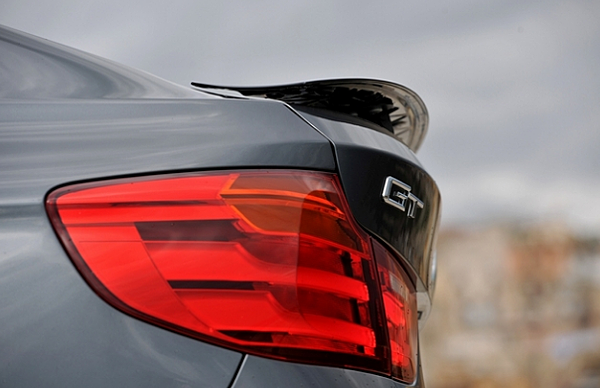 320i,328i GT車尾部分,除了BMW招牌的燈條式尾燈組外,3 Series GT也配置了BMW首款主動式後擾流尾翼,速度達每小時110公里,主動式後擾流尾翼就會自動升起,提升35%的後軸下壓力,而當速度下降到時速70公里以下時,主動式後擾流尾翼就會自動收起。與5 Series GT的兩片式尾門開啟設計不同,3 Series GT車尾行李箱直接採用了單片式尾門設計,因此3 Series GT可以規納在廣泛定義的5門斜背車中。