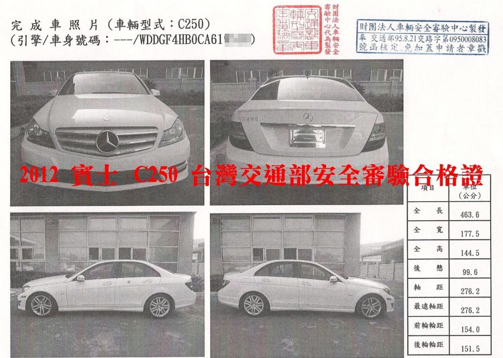 四,驗車:檢測時間約2~4週(視車型及檢測項目而定),下圖是這台賓士C250通過台灣交通部安全審驗合格證明。