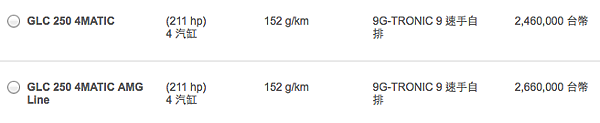 台灣賓士總代理GLC250的空車價格$246萬,AMG Line版空車價格$266萬,GLC250 Coupe空車價格$259萬,AMG版價格$279萬