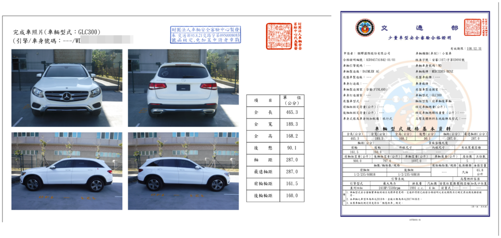 上圖是宋大哥美規賓士GLC300外匯車通過台灣交通部安全審驗合格證明