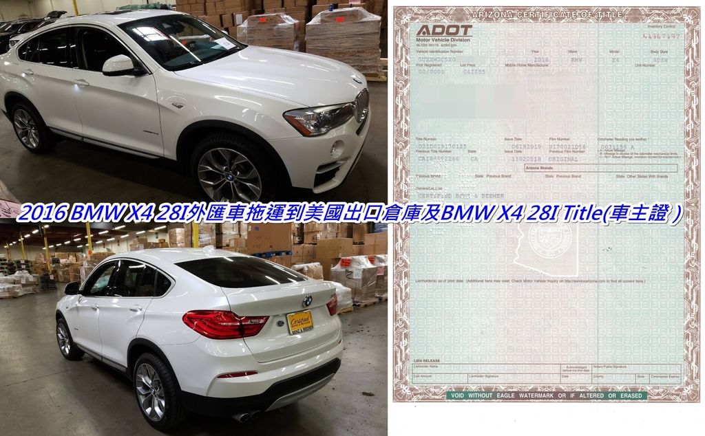 右邊為BMW X4在美國的汽車行照(Title),這是一份很重要的出口報關文件,BMW X4外匯車運回台灣後,進口報關,ARTC驗車都需要用到.