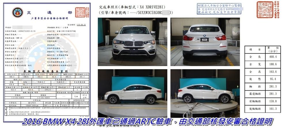 劉小姐的2016 BMW X4 28I外匯車順利通過ARTC驗車,並由交通部核發的安審合格證,就可以到監理站申請領牌,